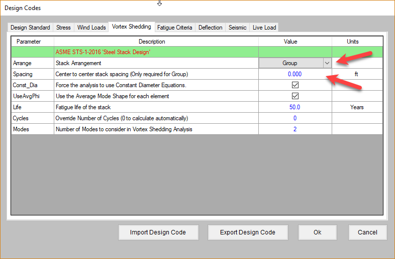 A group of stacks is a bit of a tricky issue. The ASME STS-1 code doesn’t give a lot of guidance on design of a group of stacks. STS does have a calculations for the Strouhal number for a group of stacks, and the Strouhal number dictates the critical wind speed at which the stack can vibrate. MecaStack allows you to model this aspect by entering the “Group” option and specifying the spacing.